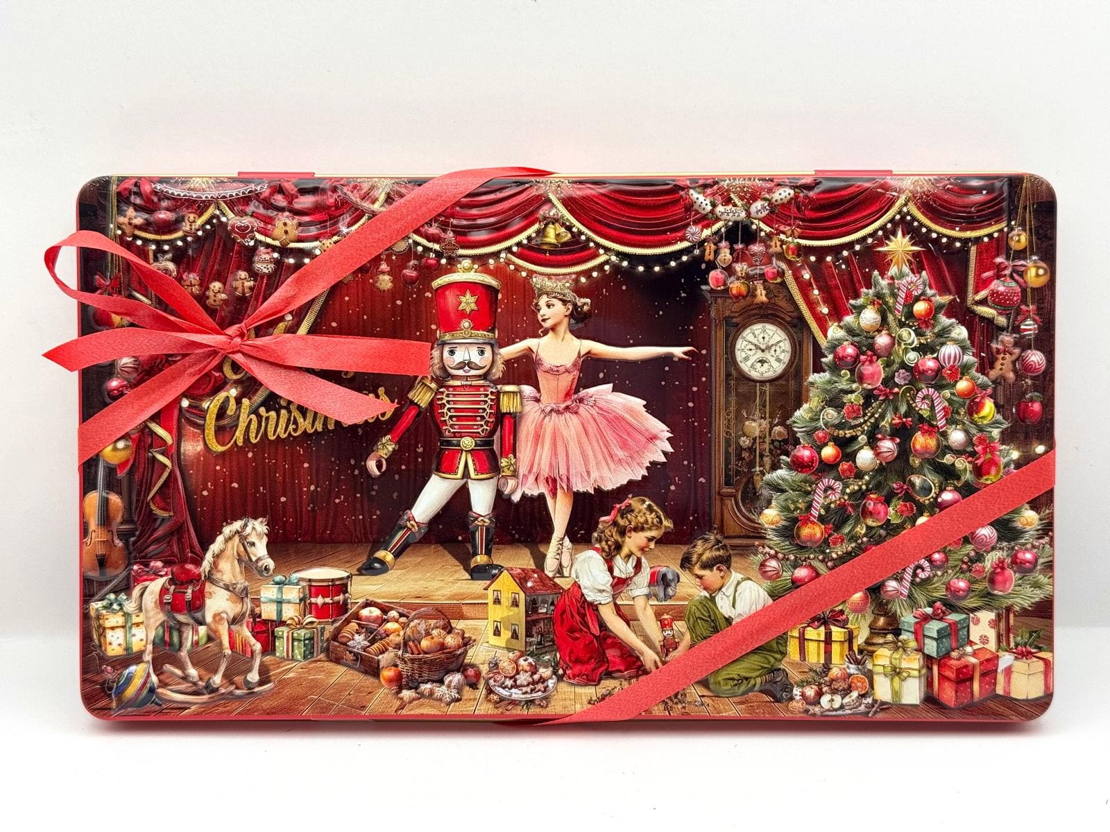Sous les lumières tamisées d'une salle de théâtre, une ballerine en tulle rose virevolte aux côtés d'un vaillant soldat de bois. Le sapin ancien scintille, les jouets semblent s'animer, et l'aiguille d'une pendule suspendue marque l'heure des rêves. Cette scène féerique, gravée en relief sur un coffret en métal, raconte l'une des plus belles légendes de Noël : celle du Casse-Noisette.